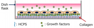 - The normal cells require the adhesion between cell and cell or cell and ECM for their proliferation. ECM is composed of basement membranes including collagen group, non-collagenous glycoprotein group such as fibronectin, vitronectin, laminin, and so on, elastin group, and proteoglycans such as heparin, hyaluronic acid and so on. Therefore, the combination of these substances becomes a model of ECM to cultivate cells. The cell-culture ware can be dually coated with collagen and HCPS. On the surface of culture ware, collagen promotes cellular proliferation and HCPS provides growth factors (GFs) to cultured cells by immobilizing GFs via the heparin moieties.
