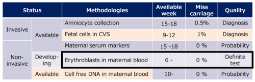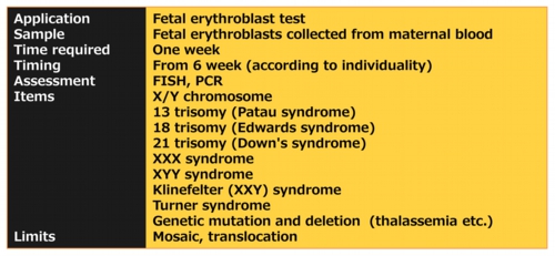 - Reason why erythroblasts become the target of prenatal test concerns the life span of blood cells. For example, lymphocyte's life span is several years, therefore, fetal lymphocytes in maternal blood cannot deny the possibility of former pregnancy origin. In other words, it is the possibility of older brother/sister origin. In contrast, erythroblast's life span is less than a year, thus there is no anxiety for the prenatal test.