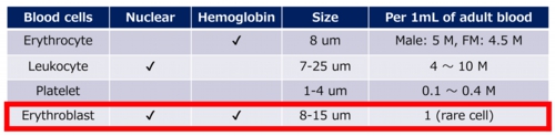 - From the profile of blood cells described below, the isolation of erythroblasts from leukocytes turns out to be difficult in terms of the insignificant difference of size between leukocytes and erythroblasts. In addition, low existence ratio of erythroblasts is the substantial difficulty for precise isolation.